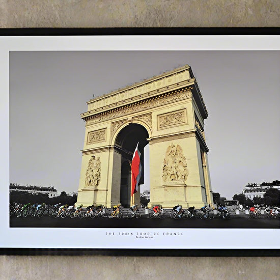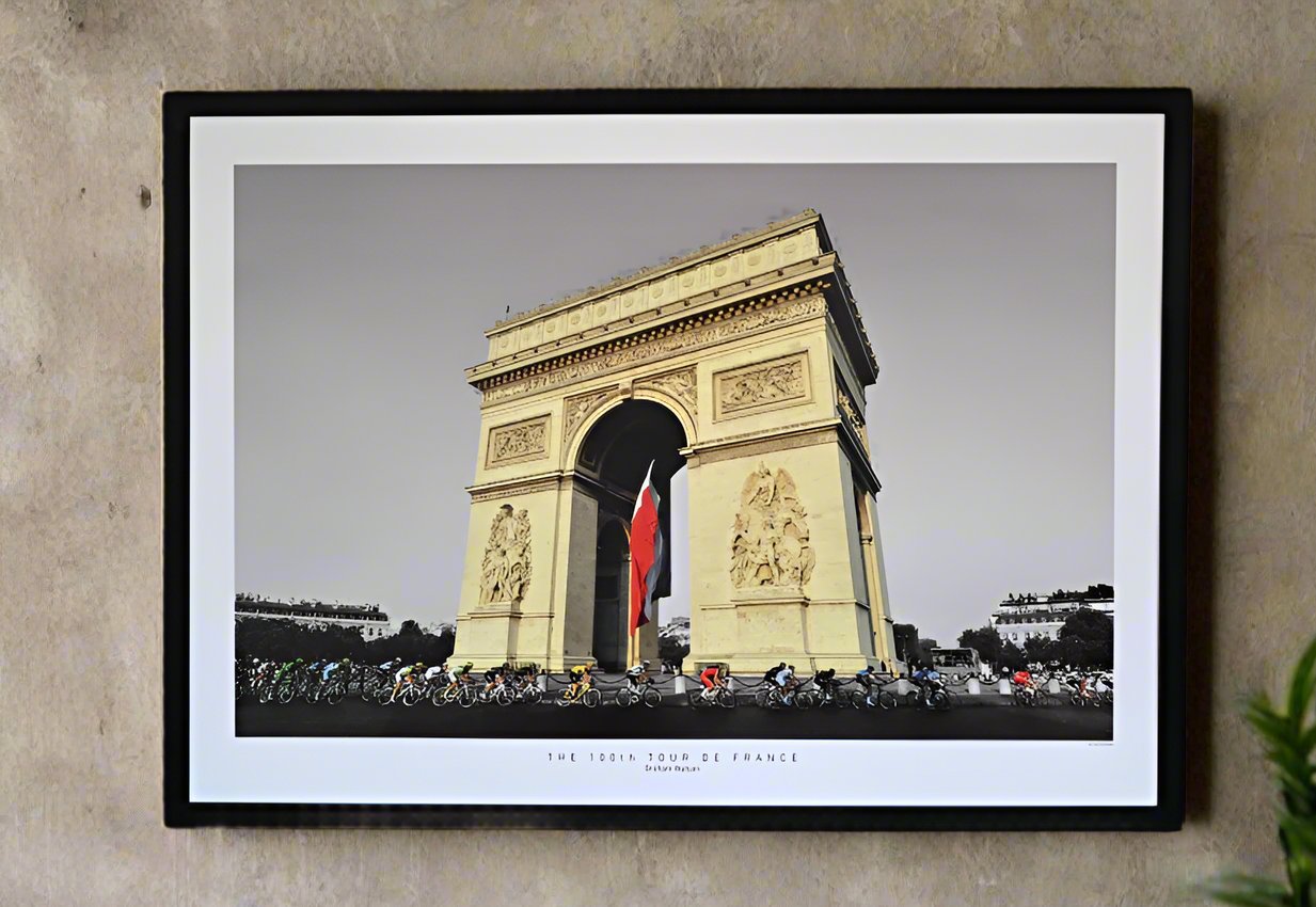 Graham Watson Collection Poster. 2013 Tour De France. The peloton sweeps past the Arc de Triomphe in the final stretch of an epic stage. Marcel Kittel of Team Argos–Shimano surges in the last sprint, claiming victory on the Champs-Élysées in the final stage of the 2013 Tour de France, beating rival Mark Cavendish.
