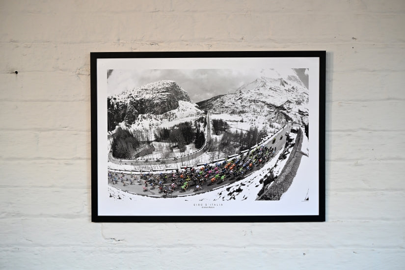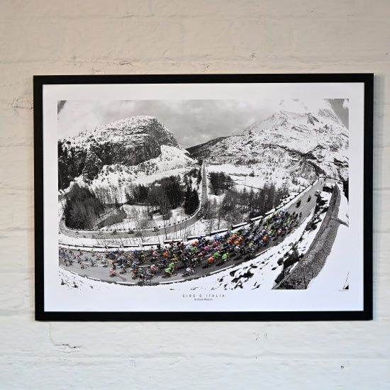 Graham Watson Collection Poster. Giro d'Italia. The peloton ride through the snowy mountains during the Giro d'Italia.